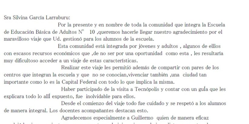 Ago252015 Carta de la agradecimiento a la Senadora de la Escuela de Educación Básica para Adultos N°10 «Amancay» de la ciudad de Bariloche por motivo del viaje de la institución a Tecnópolis.